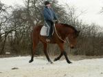 Foto z prvních krůčku drezůrní přípravy pár dní po Mařenčině stěhování. Drezura je samozřejmě pro dosud pouze dostihově připravovanou Mařenku úplné novum.